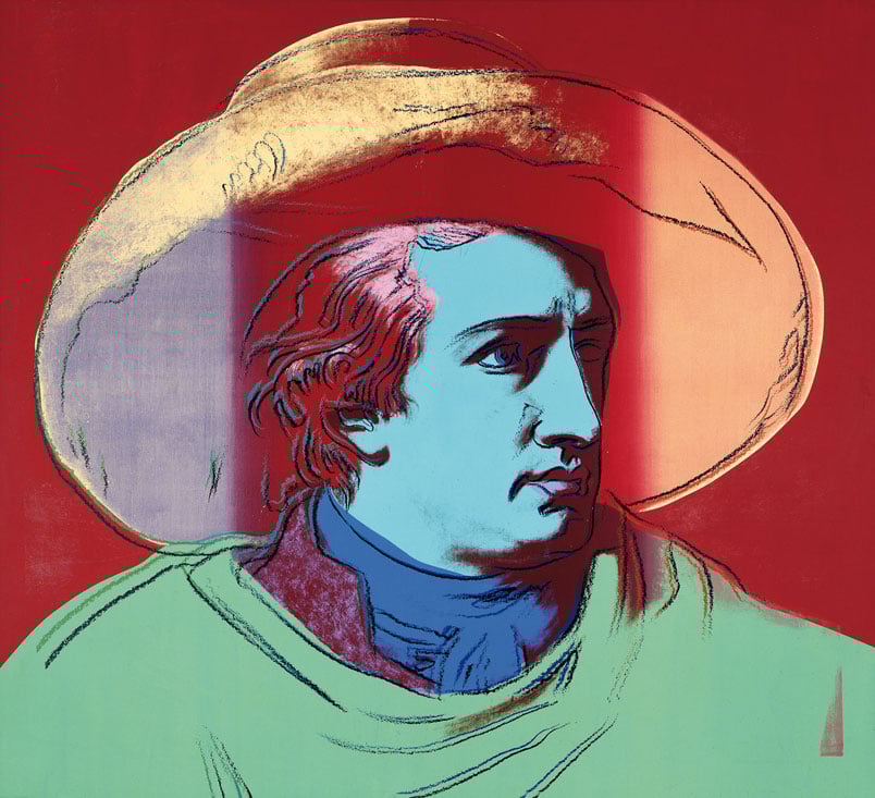 Johann Tischbein’s ‘Goethe in the Roman Campagna 1786-87’ is an iconic painting though the anatomy of Goethe is poorly executed. Nevertheless Warhol fell in love with this painting, chopped off Goethe's head and created in that same year a huge painting of it. In 1982 Warhol produced his Goethe screenprint series and "promoted" Goethe to Marilyn cult stardom.