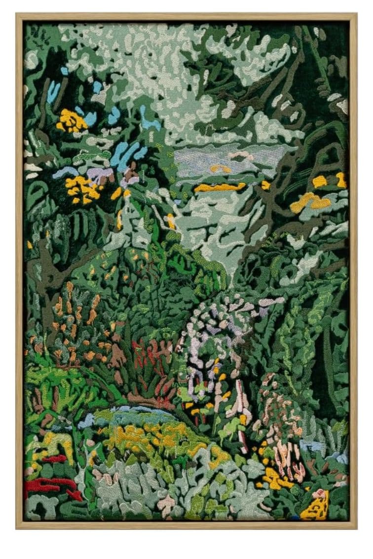 In Paysage d’Intérieur an enchanting scene is translated into delicate embroidery. The edition focuses on light and materiality, an evolution of Claire’s ‘fluff’ paintings – a series of abstract works in which bold brushstrokes toy with the verdant landscapes of post-impressionist painters. With 20 colours, from lemon yellow to sea green and electric blue, Claire assembles a new vision for her original textured painting.