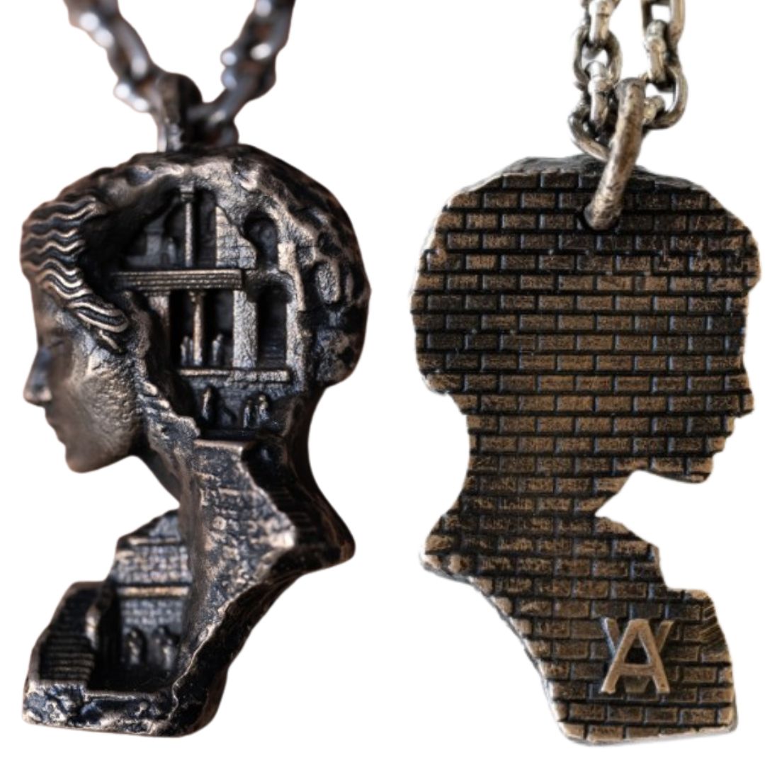 This pendant marks the first time I have brought the language of my labyrinth sculptures into a piece of jewelry. It is a female bust in the tradition of ancient Greek statuary, interrupted by staircases, doorways, and miniature figures that seem to move through it. Cast in bronze using the same processes as my large scale works, it carries all of the presence of sculpture into a form you can wear.