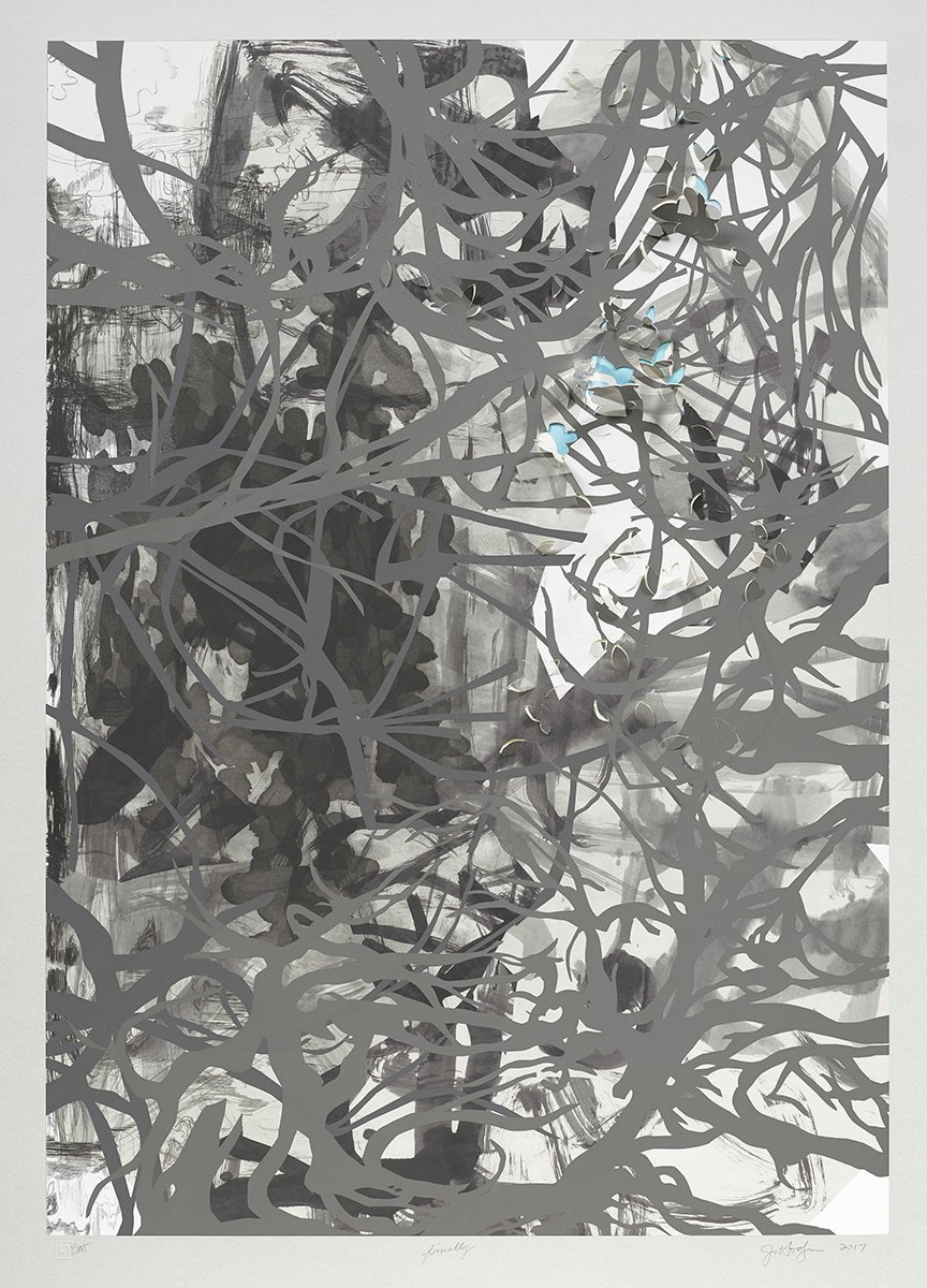Medium: Intaglio (aquatint, drypoint, sugar lift and spit bite), screen-printing, digital pigment printing, chine collé, hand cut and folded with a holographic foil element.