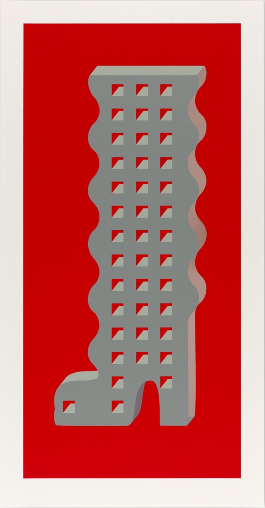 Hamilton’s edition, entitled Thirteen Storey Wavey Boot is a proposal drawing for an unlikely apartment building, Made as a silkscreen print, the boot sits in high relief, two dimensional and flat, like many of Hamilton’s sculptures. The image is built from precisely balanced muted colours and glossy details against a background of pure red to give an illusionistic depth that is both vertiginous and seductive.